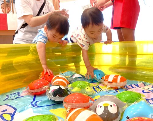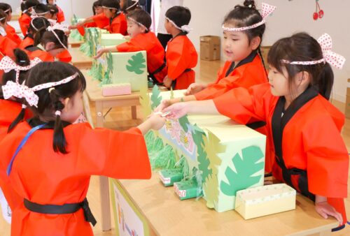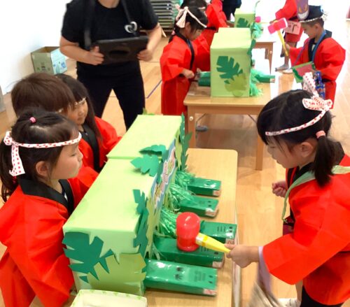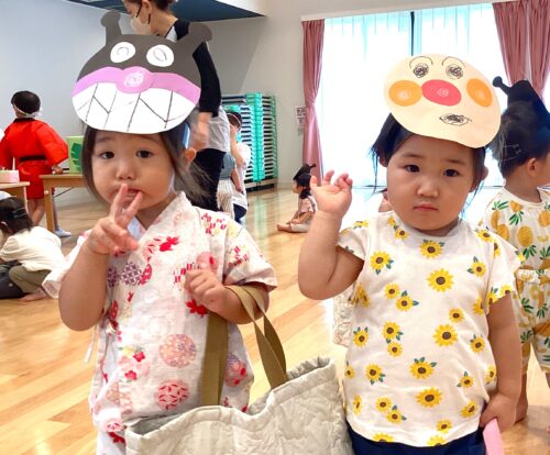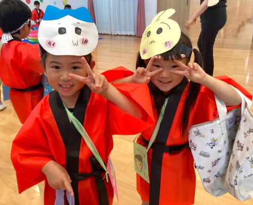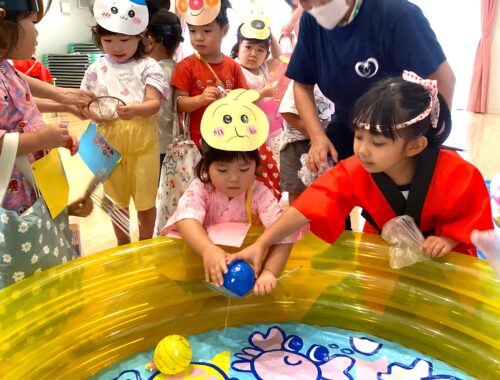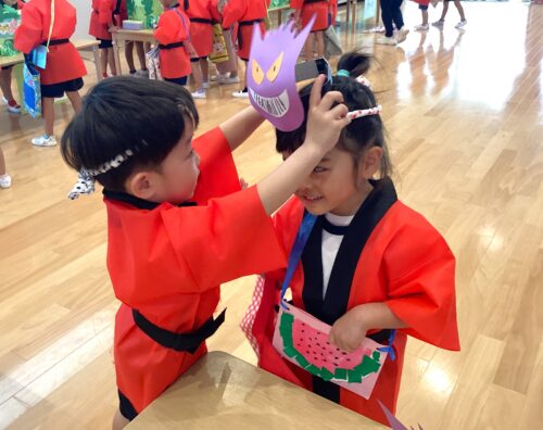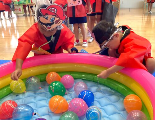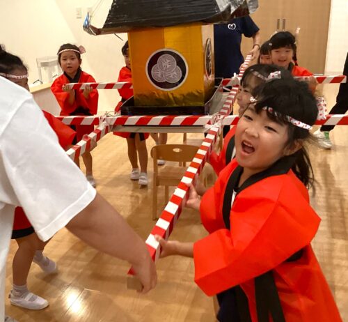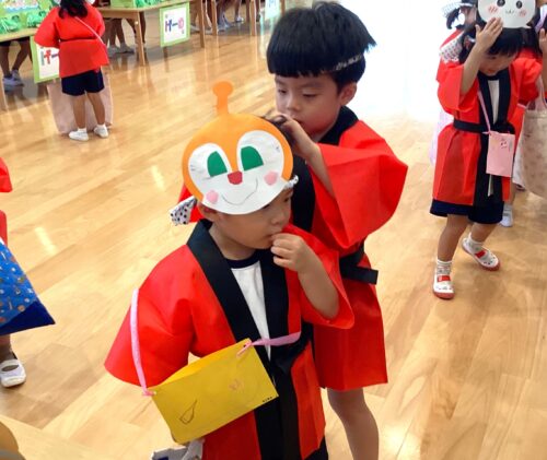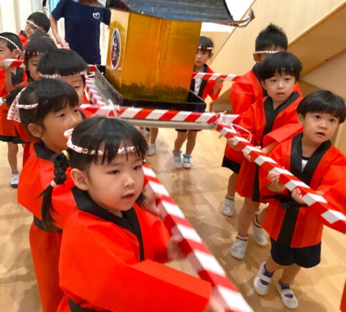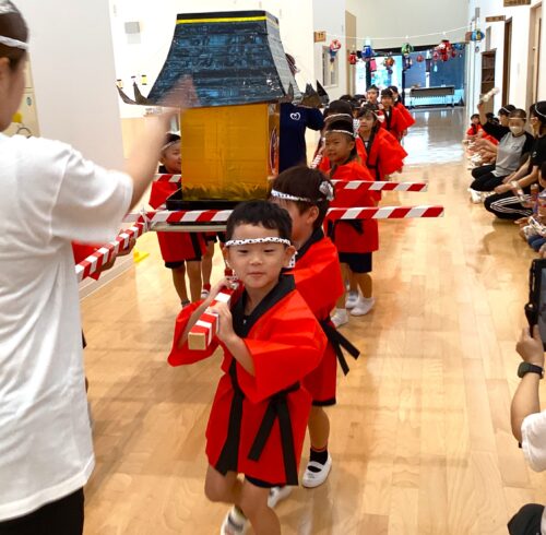 8月は子ども達が楽しみにしていたイベントや活動がたくさんありました。その中でも8月1日のとまと保育園の夏祭りは、とても楽しみにしていたイベントで、当日は大盛り上がりでした!かぼちゃ組・じゃがいも組・にんじん組の子ども達はお揃いの赤い法被をまとい「わっしょい、わっしょい♪」と元気いっぱいお神輿を担ぎ、園内を練り歩きました!