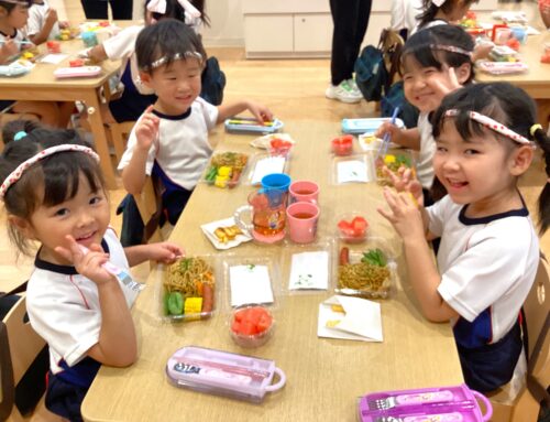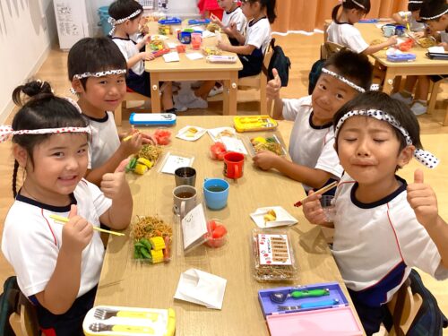 今年も給食は屋台風で「焼きそば」に「フランクフルト」「ポテト」「とうもろこし」「スイカ」と美味しいものがあり、嬉しそうに頬張る姿がとても可愛かったです!
