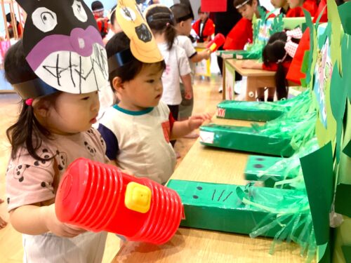 出店のゲームコーナーでは、ワニワニパニックのピコピコハンマーを振り上げ、どこから出てくるかわからないワニにドキドキハラハラ!