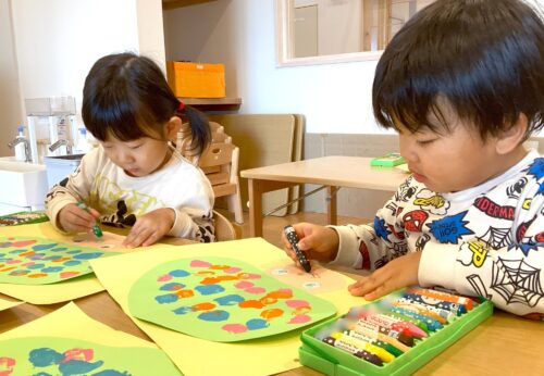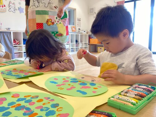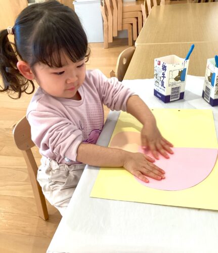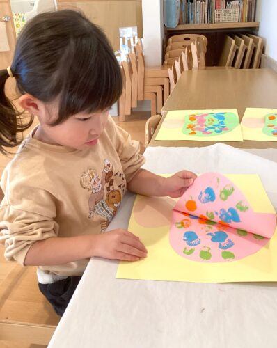 デカルコマニーに挑戦です!好きな色の絵の具を選び画用紙に模様を描きました!そのあとは画用紙を半分に折り・・・