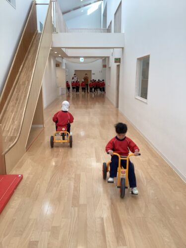 ここ数日お天気が悪く、なかなか外で遊ぶことができない子ども達ですが、そんな時は、遊戯室で体操やゲームをしたり、アスレチックルームで身体を動かしていますが、今日は長ーーーーい廊下を使い三輪車レースをしました!