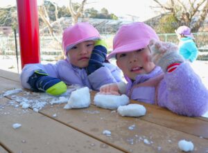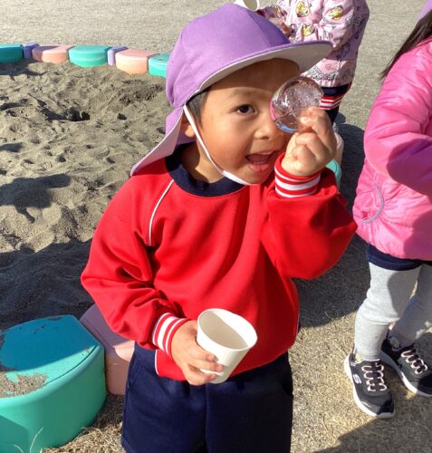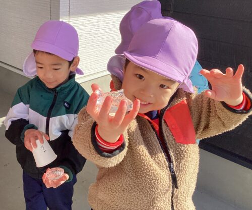 気温がぐっと下がり冷え込む毎日ですが、子ども達はその寒さを使って遊びに変えています!前日に名前を書いた自分の紙コップを用意し、お水を入れ陰になる場所を探しました!ちょうどいい場所をみつけ、コップを置き、一晩待ちますzzzz