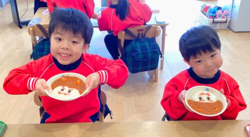 集会の後は楽しみにしていた給食です!豆まきをして、お腹がペコペコな子ども達!