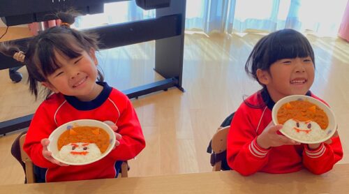 鬼の顔がかわいい、ドライカレーを見て大喜びです♬